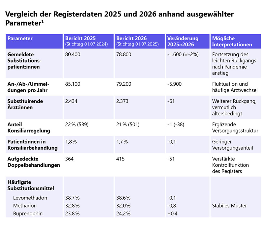 In Deutschland sind über 160.000 Menschen opioidabhängig.[2] Die Folgen der Abhängigkeit sind für Betroffene und ihre Angehörigen weitreichend. Mit einer geeigneten Substitutionstherapie können sich wirksame Auswege für Betroffene öffnen. Im Bericht 2025 wurde für den Stichtag 1. Juli 2024 eine Gesamtzahl von rund 80.400 Substitutionspatient:innen ausgewiesen. Der Bericht 2026 zeigt dagegen einen weiteren Rückgang: Für den 1. Juli 2025 werden 78.800 Patient:innen gemeldet. Damit setzt sich der bereits 2025 beschriebene Trend einer leichten Abnahme nach dem pandemiebedingten Anstieg der Jahre 2020–2023 fort. Auffällig ist zudem die weiterhin hohe Dynamik im Register: Für 2025 wurden 79.200 An-, Ab- oder Ummeldungen dokumentiert (2024: 85.100).[1]