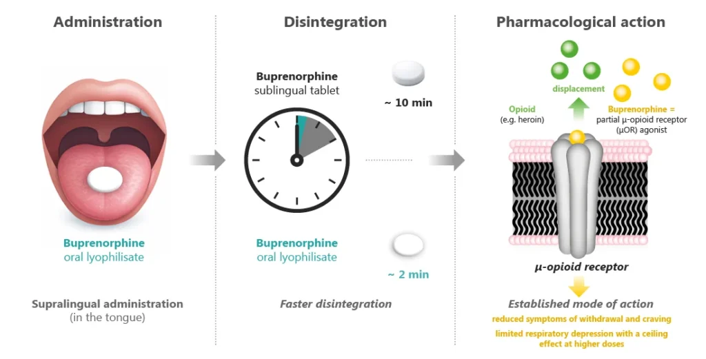 Abbildung: Buprenorphin als Lyophilisat zum Einnehmen: galenische Besonderheit mit rascher Desintegration bei etabliertem Wirkmechanismus als partieller μ-Opioidrezeptor-Agonist[9].